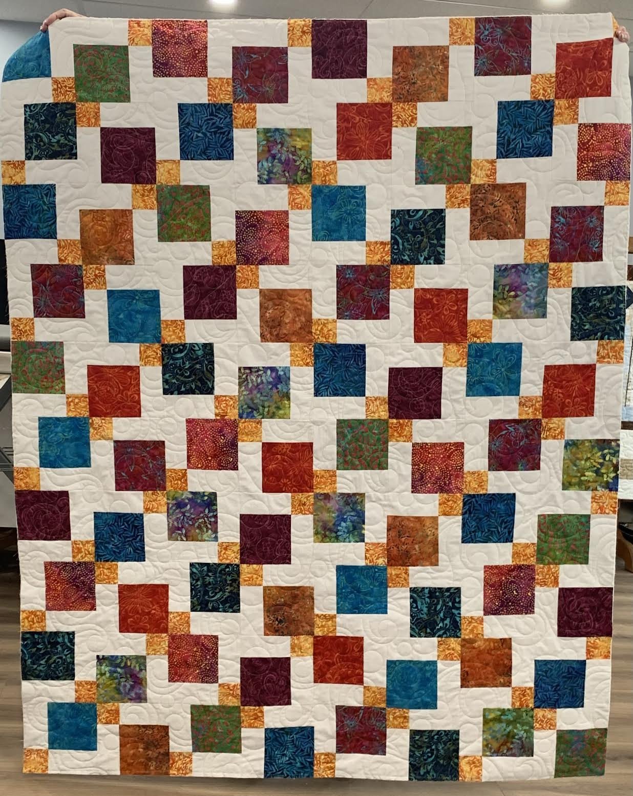 | Requirements: | Sewing machine and manual Basic sewing kit which includes: Thread and bobbin, Scissors, 1/4" foot for sewing machine (if available), Seam ripper, 6 1/2" x 12" ruler (if available), Quilting pins, Rotary cutter Quilt Requirements: (Does not include backing, batting) Background fabric - 1.3 m; Fabric for blocks - 5" x WOF each of 10 fabrics OR 80 (5") squares OR 1.3m of single colour; Accent fabric - 0.6 m; Binding - 0.45 m |